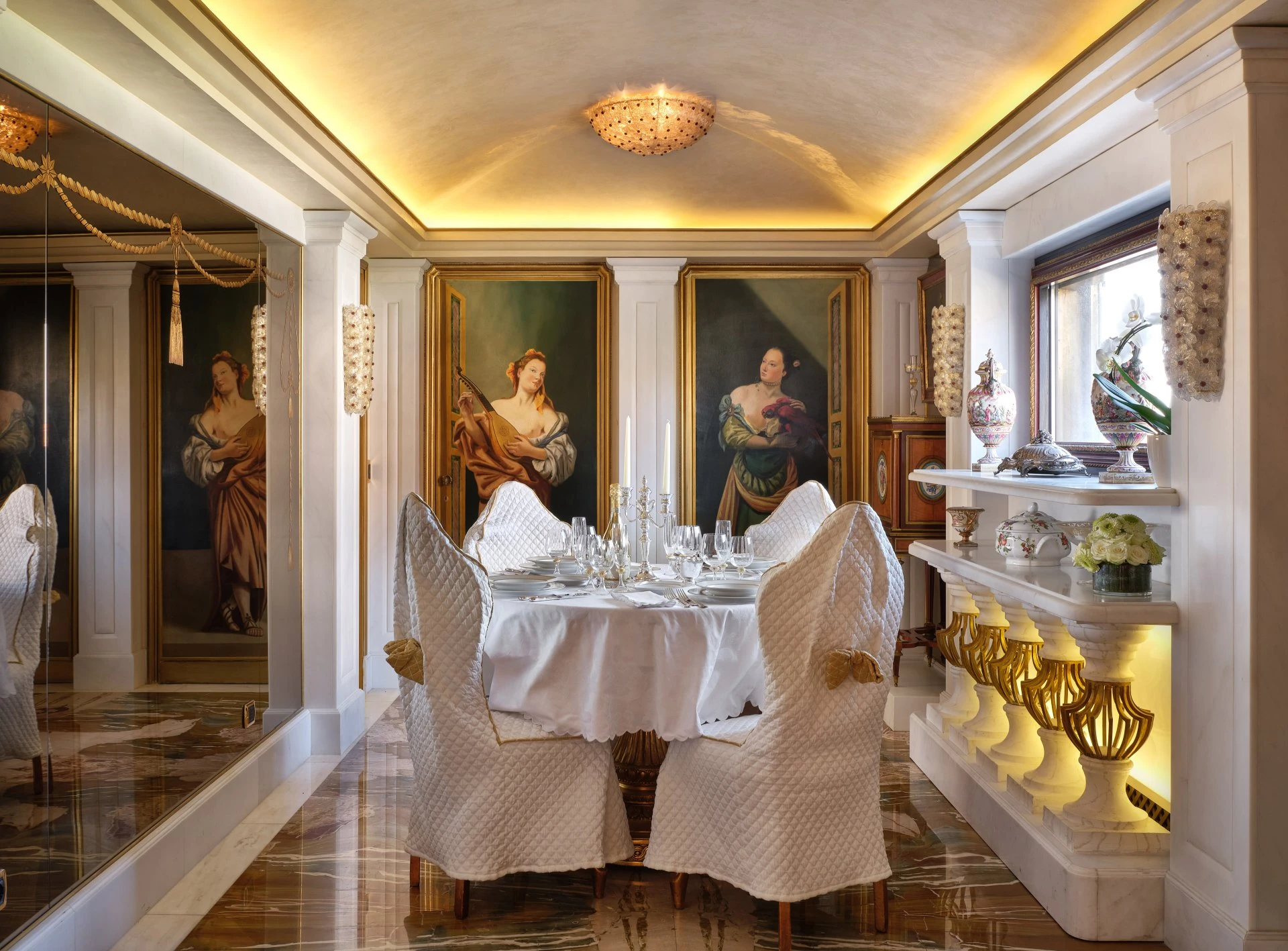 A large living room is the unrivaled King of this Residence, where the marble of the splendid floor and the crystal of the furnishings compete for the title of the most precious material. An exquisitely adorned vaulted ceiling, strategically placed lights, and top-quality artistic masterpieces in pure Renaissance style enrich this space, making it even more enchanting.