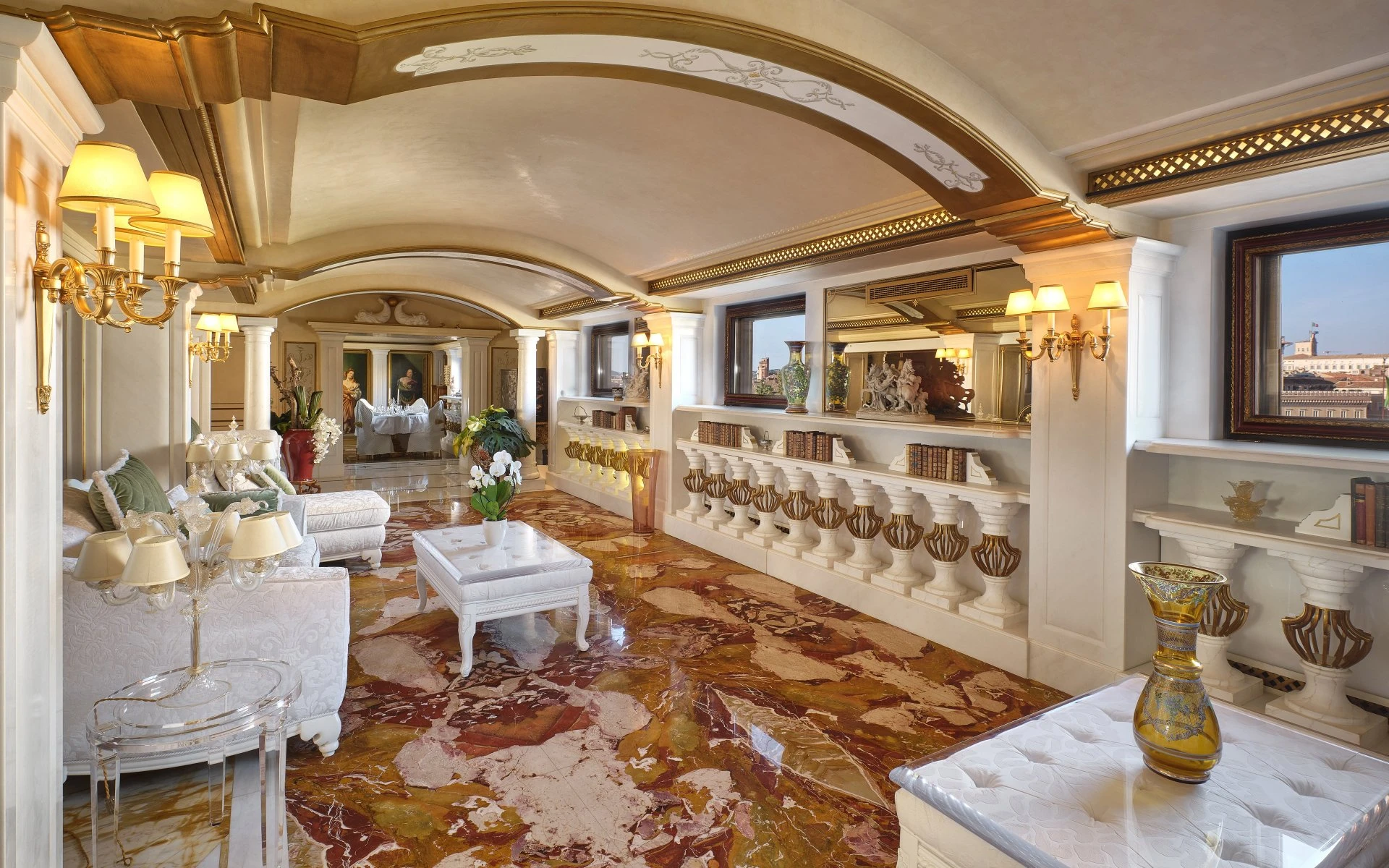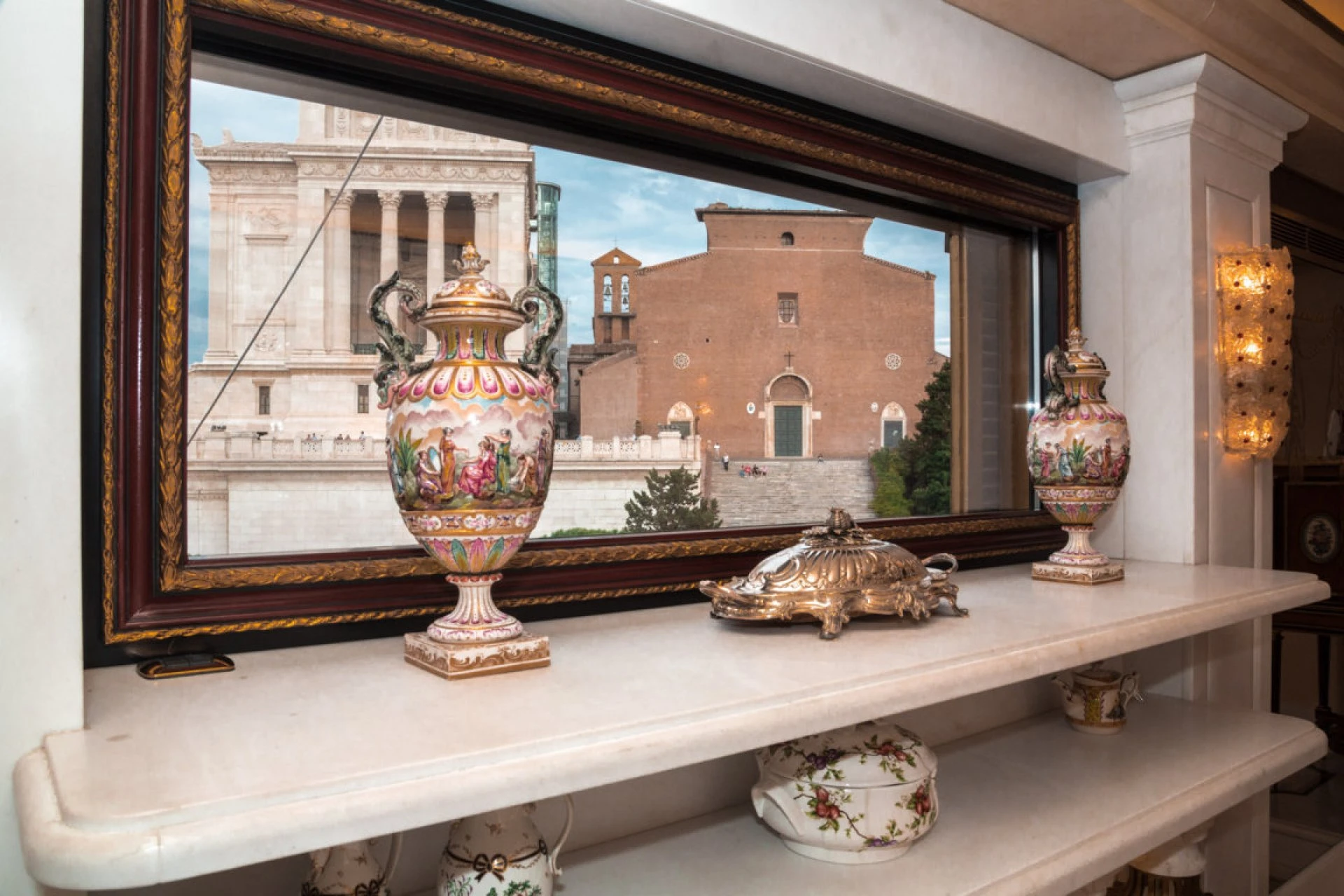 This majestic living room will take you back in time. Original frescoes and artworks frame the view of the Eternal City.
