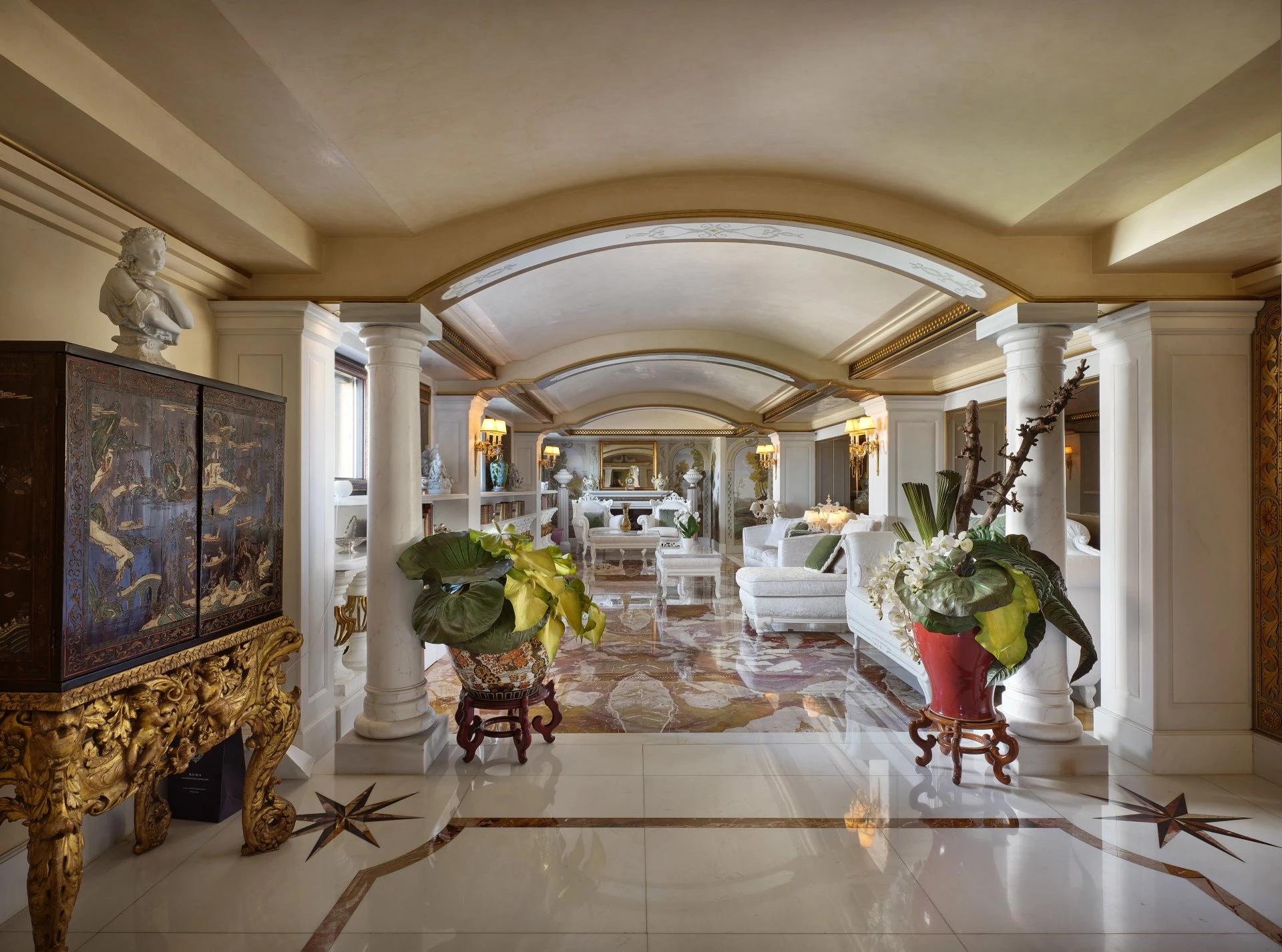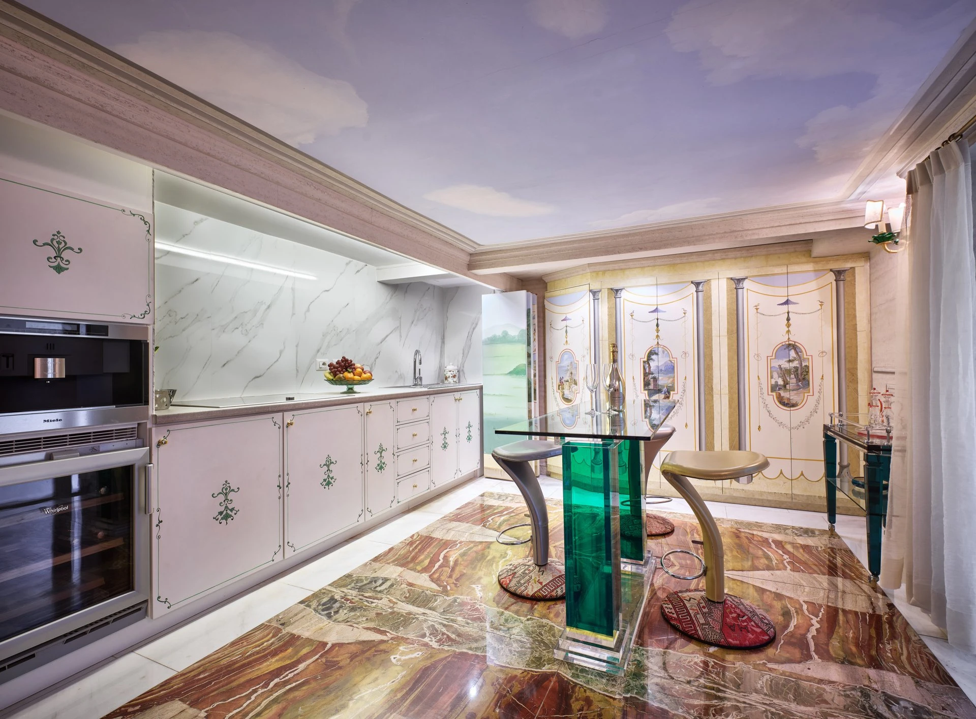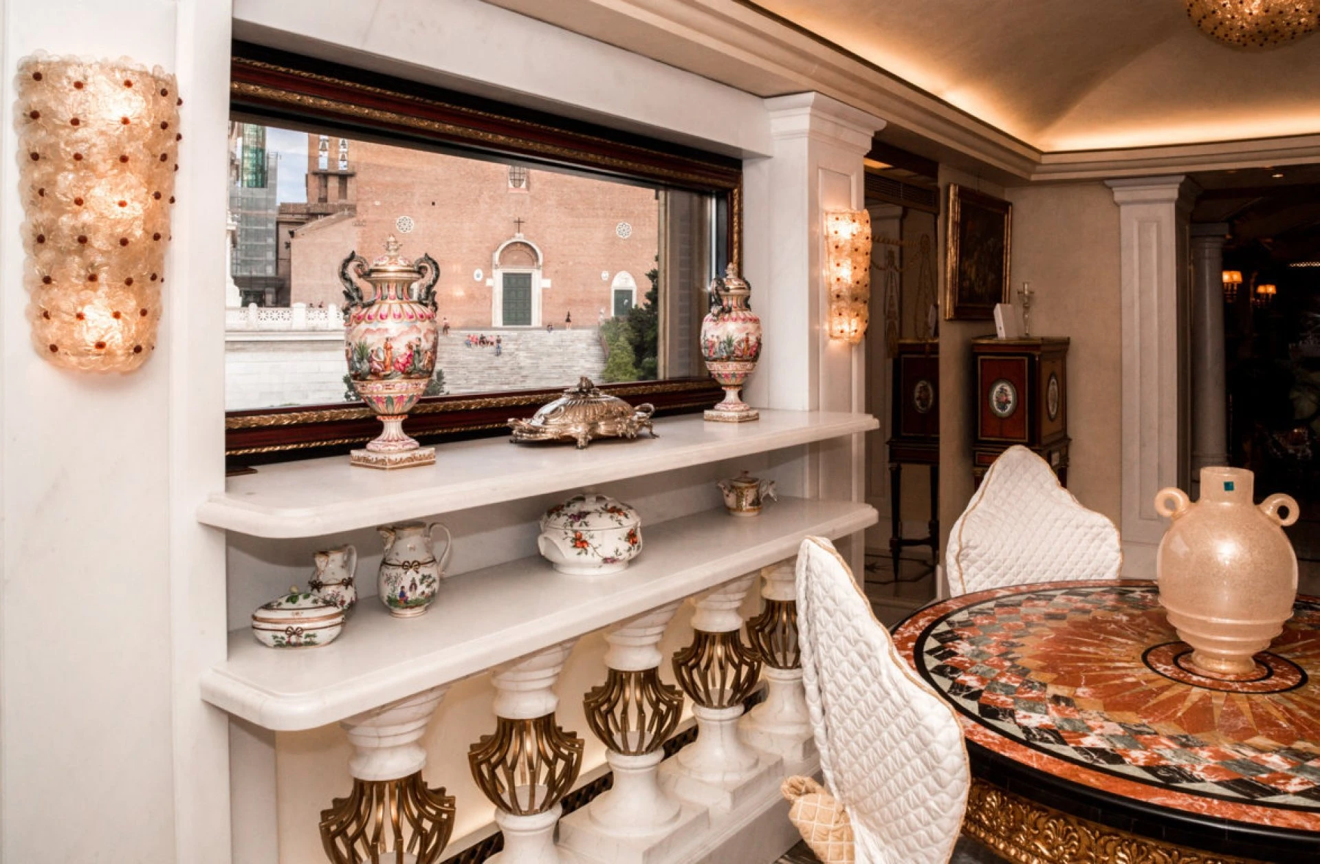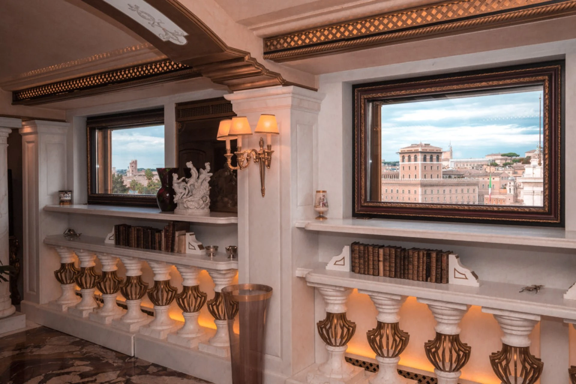 Welcoming you at the entrance is a sumptuous living room, enriched by hand-inlaid marble floors, sophisticated finishes, and original furnishings from the Roman era. Every window is a frame on Rome: the majestic figure of the Altare della Patria and the sumptuousness of the Campidoglio stand out.